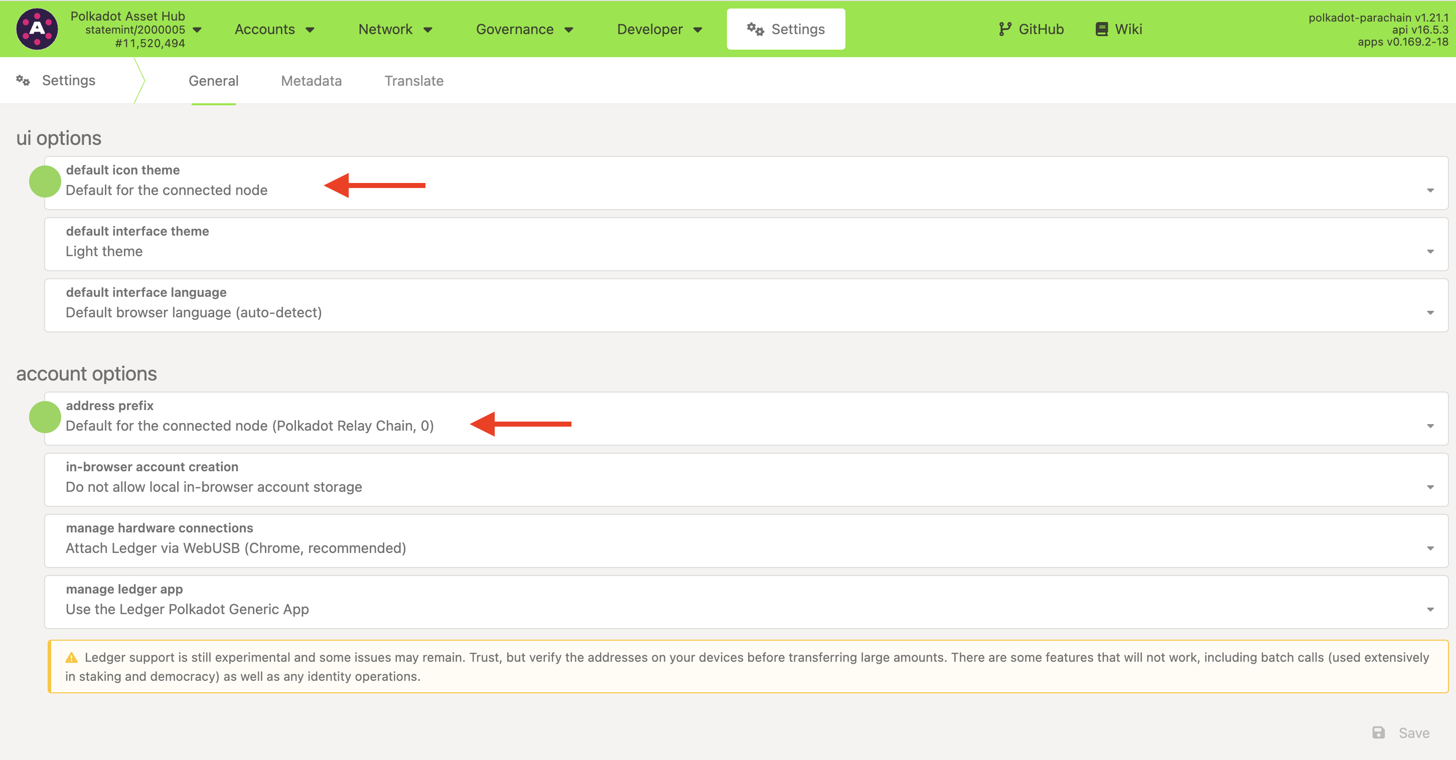 2. Select "Default for the connected node" for both "Default icon theme" and "Address prefix":
