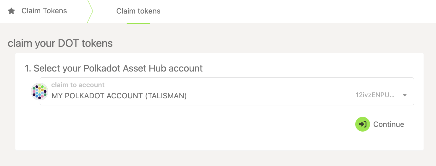 1. Once you've opened MyCrypto, you can start by navigating to the Claim Tokens page on the Polkadot Developer Interface. Select the account you would like to claim the DOT into and click the "Continue" button to proceed: