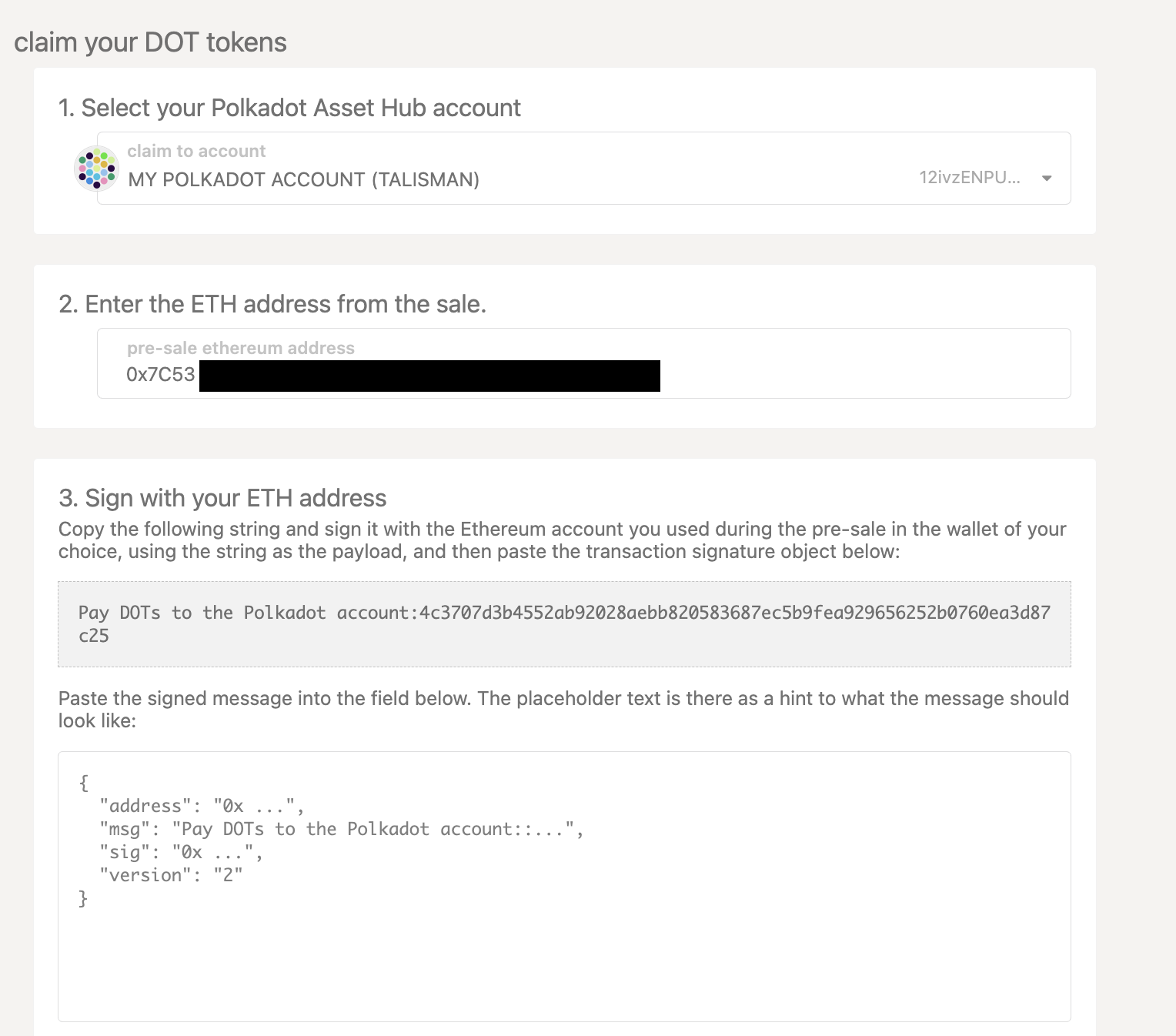 If you made a DOT purchase in one of the pre-launch sales, you will need to claim your DOT tokens. For those who made a pre-genesis claim by sending a claim transaction to the Claims contract on Ethereum, you will still need to send a free attest transaction to agree to the terms and conditions of your allocation. In that case, go to the Attesting section.