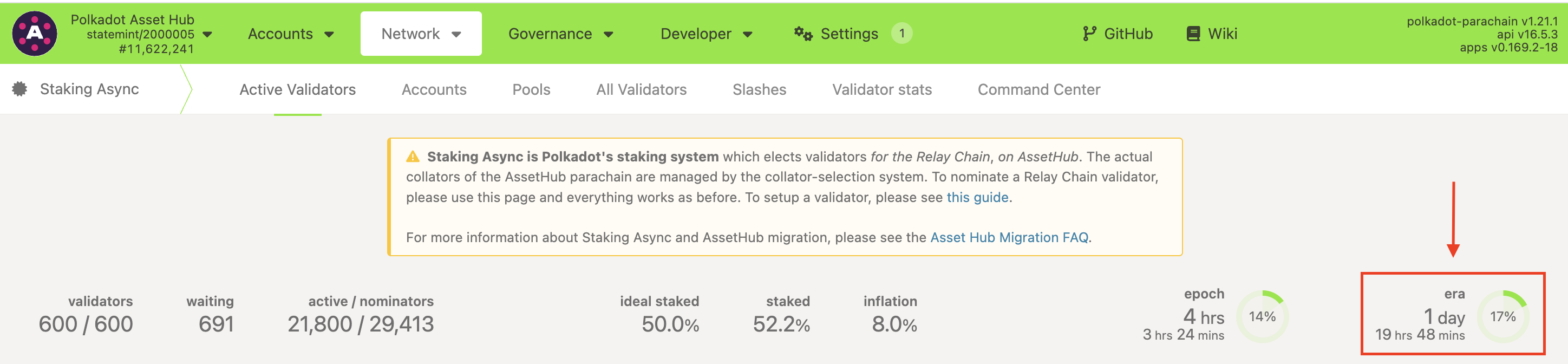 The current phase of the era can be seen in the top right corner of the Polkadot Developer Interface on the Staking Async page: