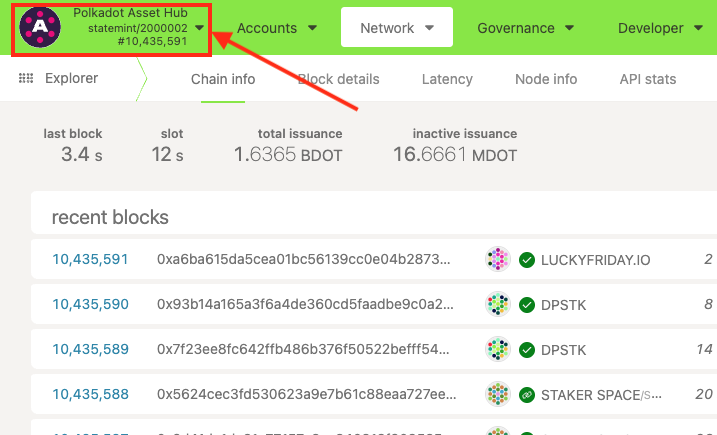 1. On the Polkadot Developer Interface, click on the currently selected network on the top left. In the case below, we currently are on the Polkadot Asset Hub network.