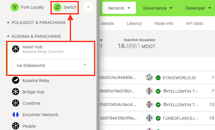 2. In the panel that opens, select the network you want to switch to. We're selecting Kusama Asset Hub. There are several nodes available and it doesn't matter which is selected. Only if you experience some connection issues, switch to another one.