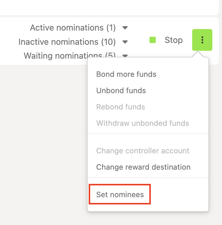 2. Click on the three dots next to the nominating account you want to use, and choose "Set nominees":