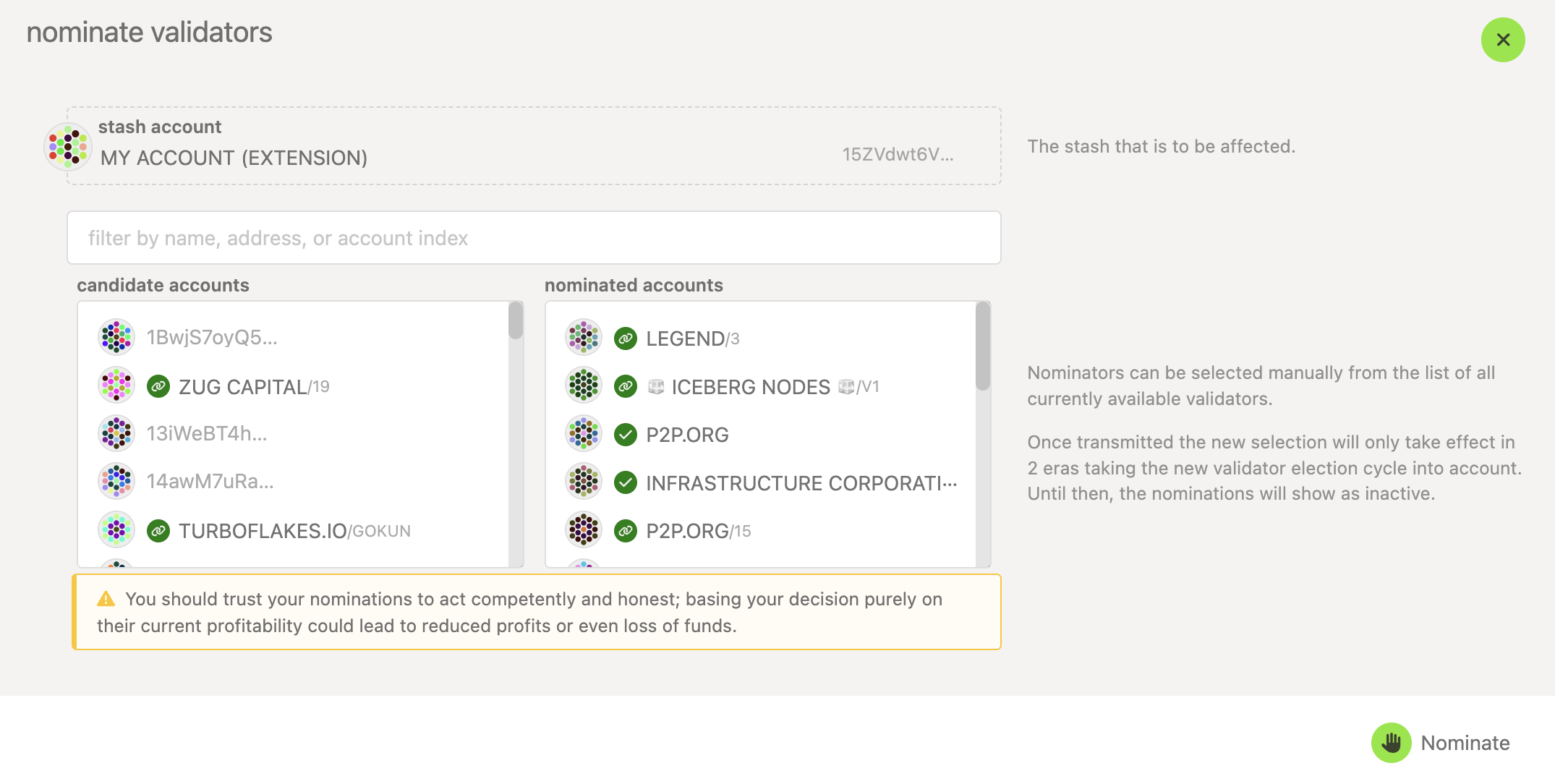 6. Once you're happy with your selection, click the Nominate button on the bottom right, then sign and submit the transaction.