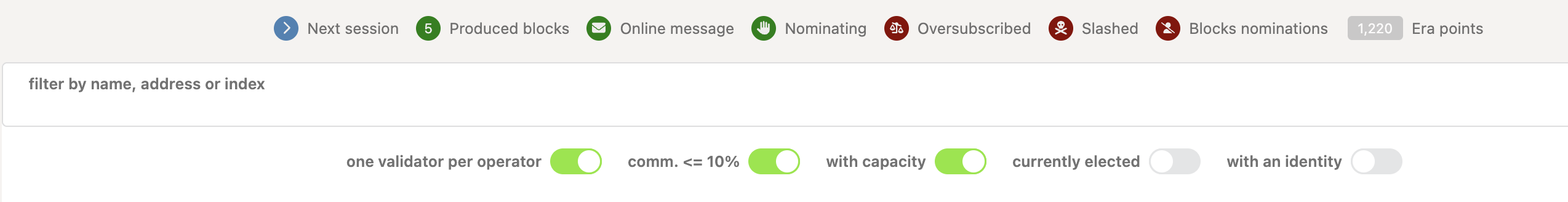 2. In this tab, you can view statistics for validators and filter them on various criteria:
