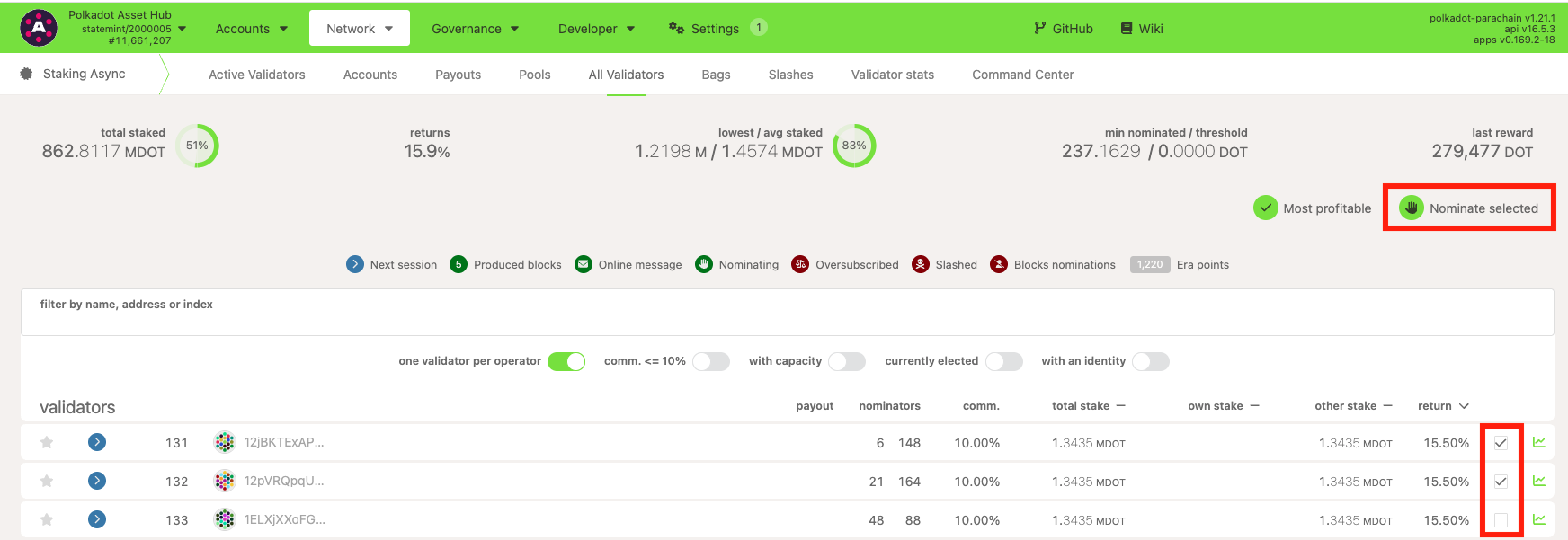 3. Click next to the validator's return to checkmark it. Once you've marked all the validators you wanted to nominate, click on the "Nominate selected" button above: