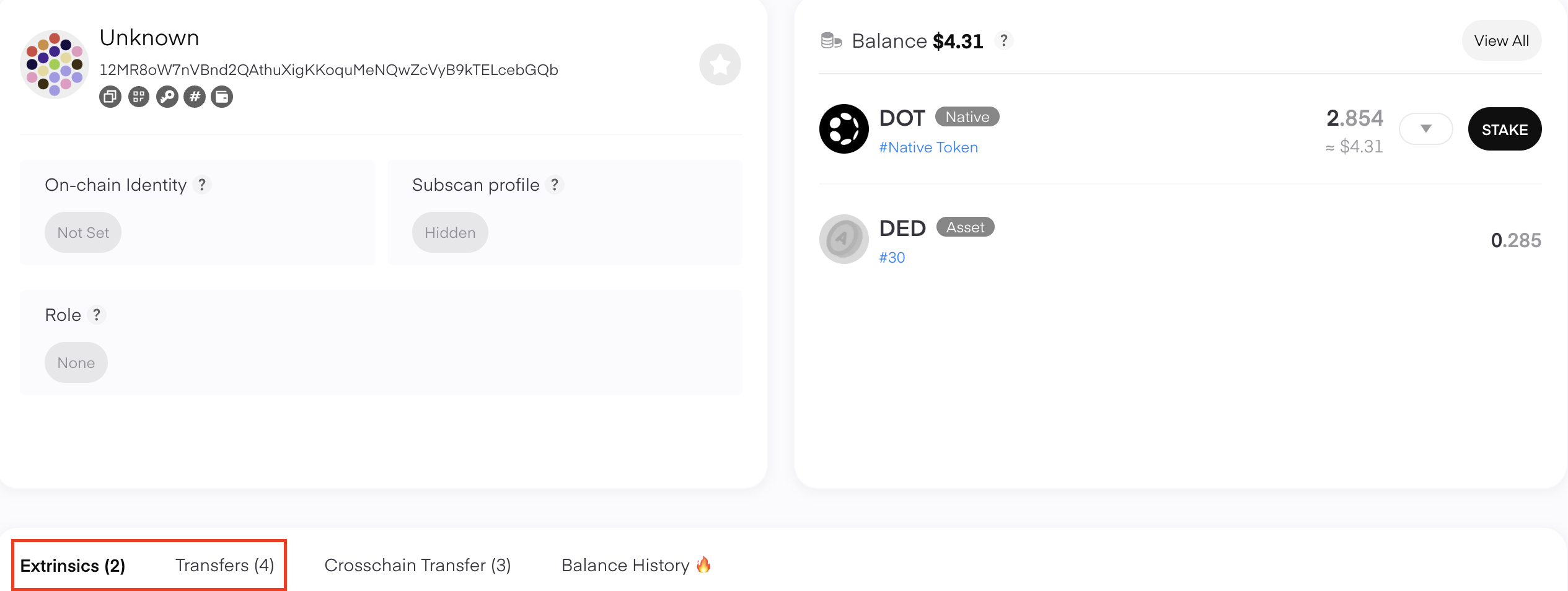 By default, the Extrinsics tab will be open, which includes any extrinsics signed from your account (including staking, voting, etc.). Switch to the Transfers tab if you'd like to see only your incoming and outgoing transfers: