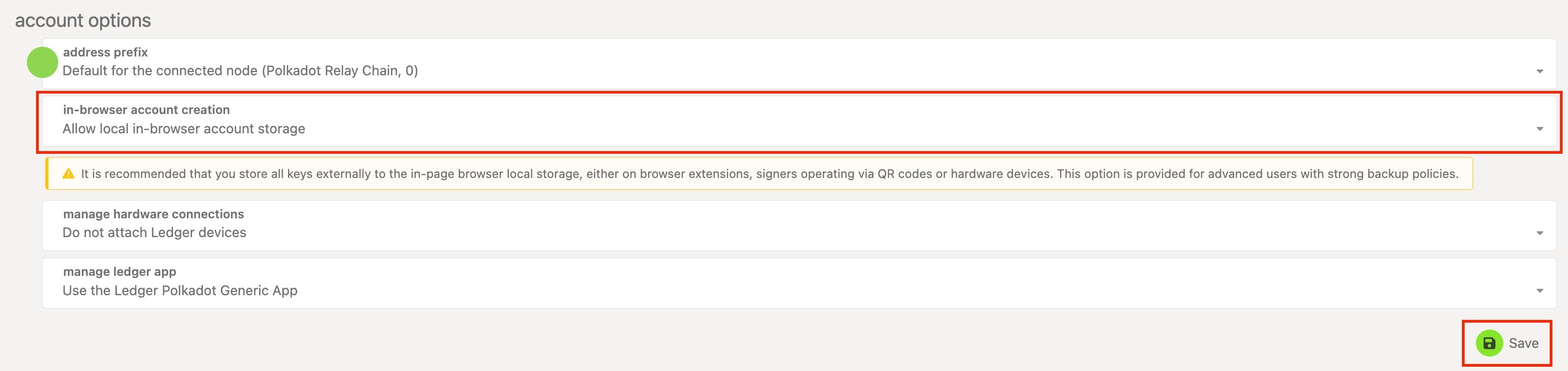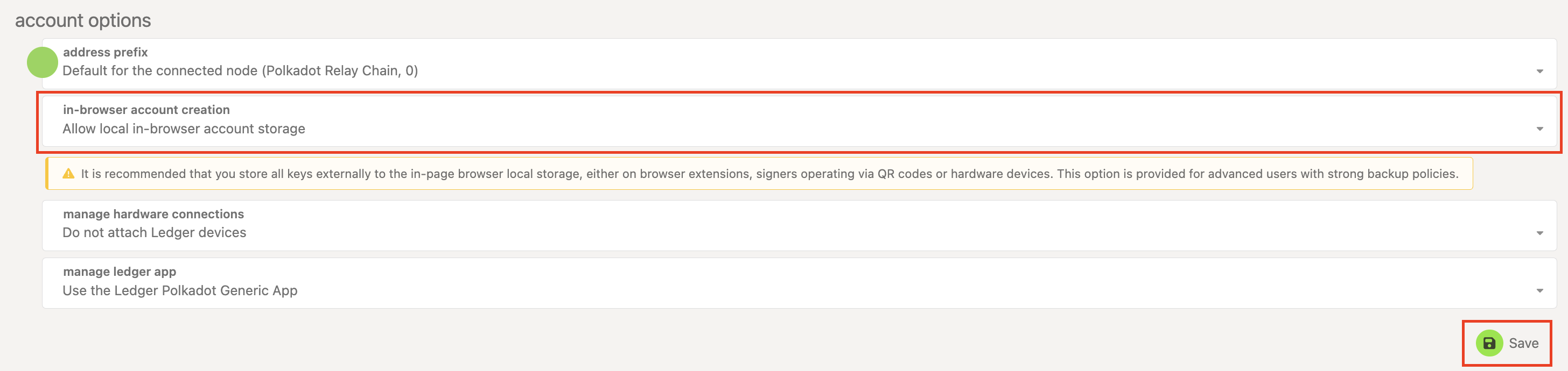 1. Go to the Polkadot Developer Interface and navigate to the Settings tab. In the account options, allow local in-browser account storage and click "Save":