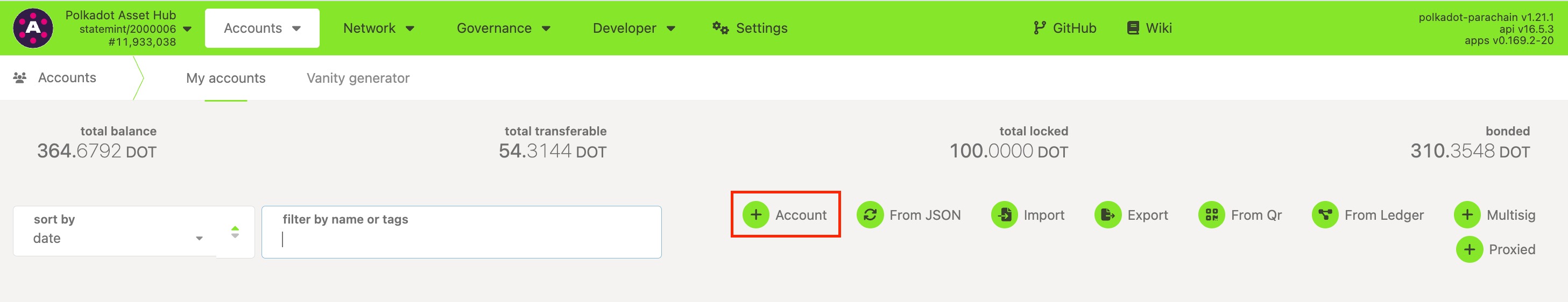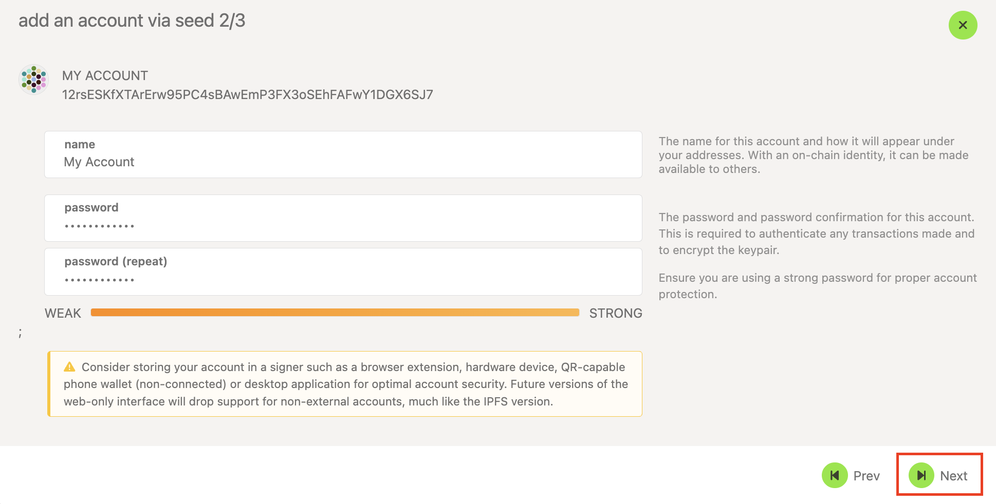 We highly recommend that you add your accounts through the Polkadot Developer Signer browser extension, as it has many advantages: