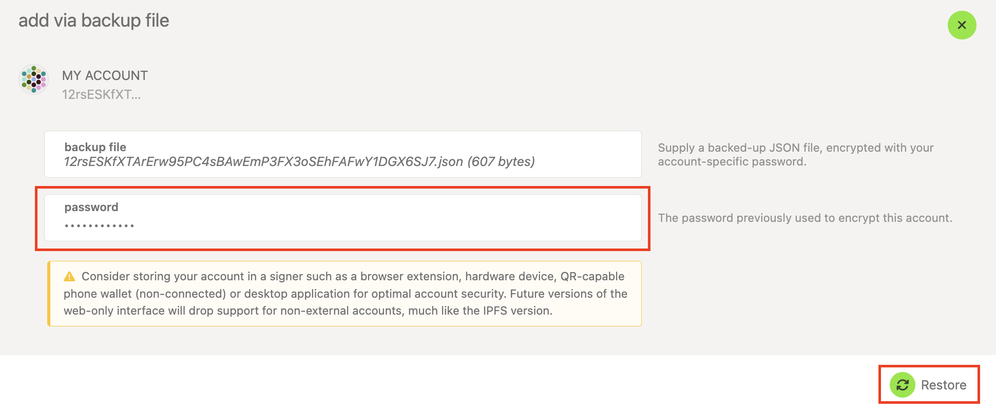 Polkadot Developer Interface (Polkadot-JS UI) is a web wallet meant for power users and developers. For everyday use, there are several user-friendly wallets funded by the Polkadot Treasury that support a plethora of features and platforms. Discover them in this article.In this article, you will learn how to restore your Polkadot account either from your mnemonic phrase, your JSON backup file, or a raw private key in the Polkadot Developer Interface.