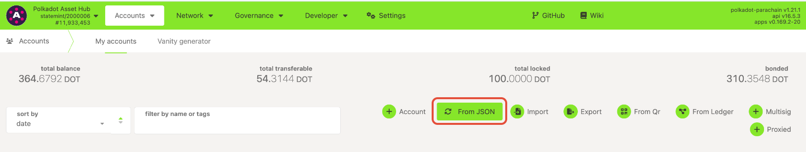 If you would like to follow a video tutorial instead, here is a video to help you restore your account from the mnemonic phrase or the JSON file from the Polkadot Developer Interface: