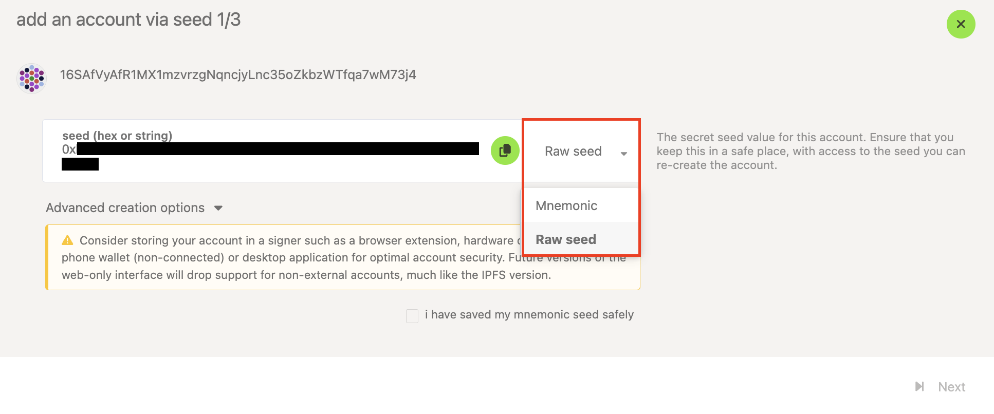 3. Click on the word "Mnemonic" and select "Raw seed" from the drop-down menu that appears. Delete the shown private key and enter yours instead.