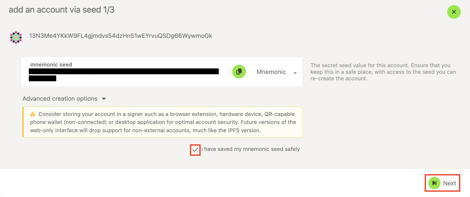 3. You'll see a 12-word mnemonic phrase. Save it safely and check the box saying you have done so, and click "Next":