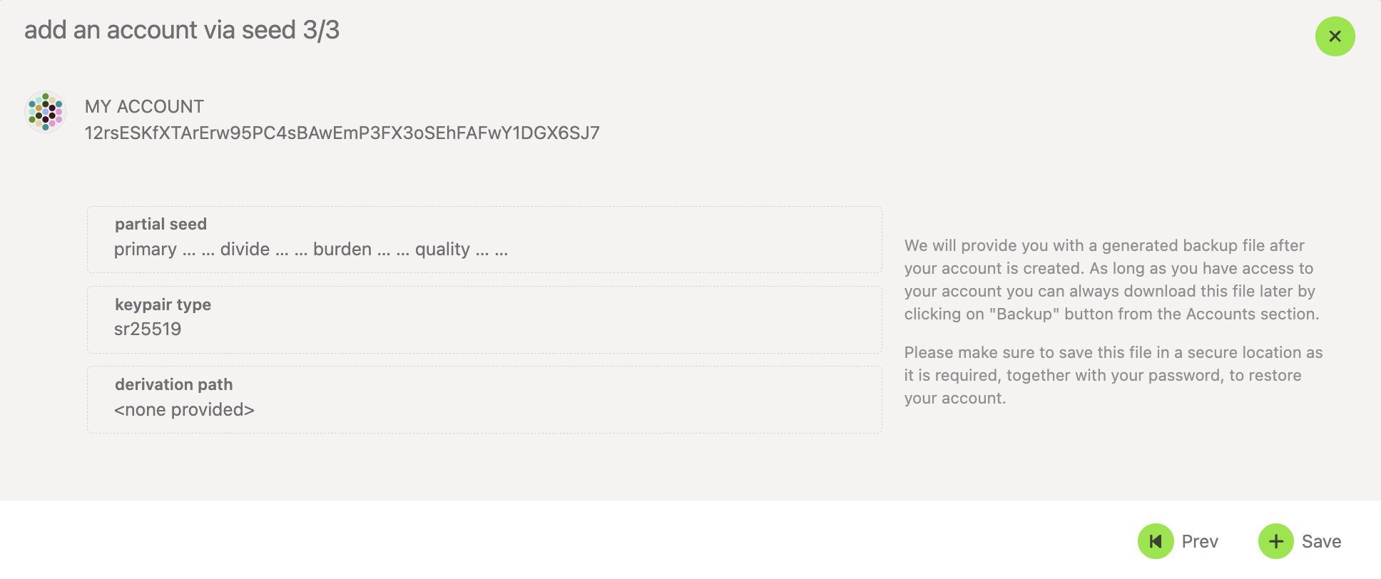 5. Review the details, and click "Save". This will also download the JSON backup file for the account on your computer: