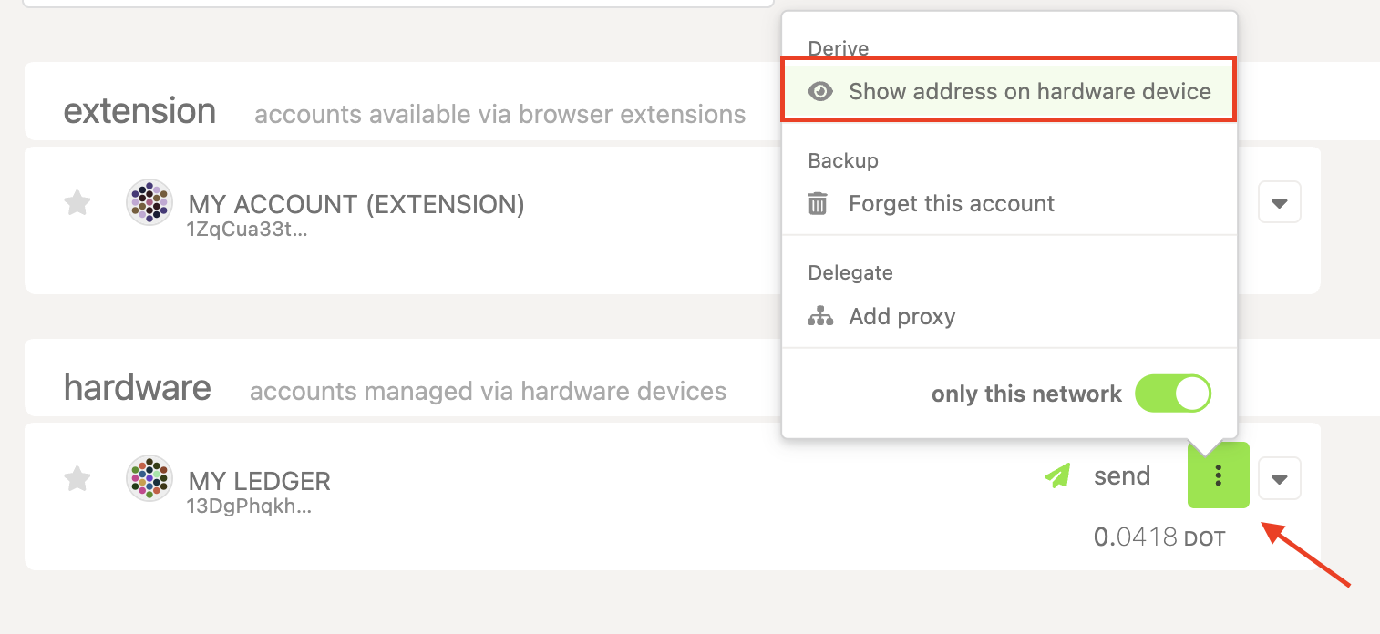 1. On the Accounts page on Polkadot Developer Interface, click on the three dots next to your Ledger account and select "Show address on hardware device":
