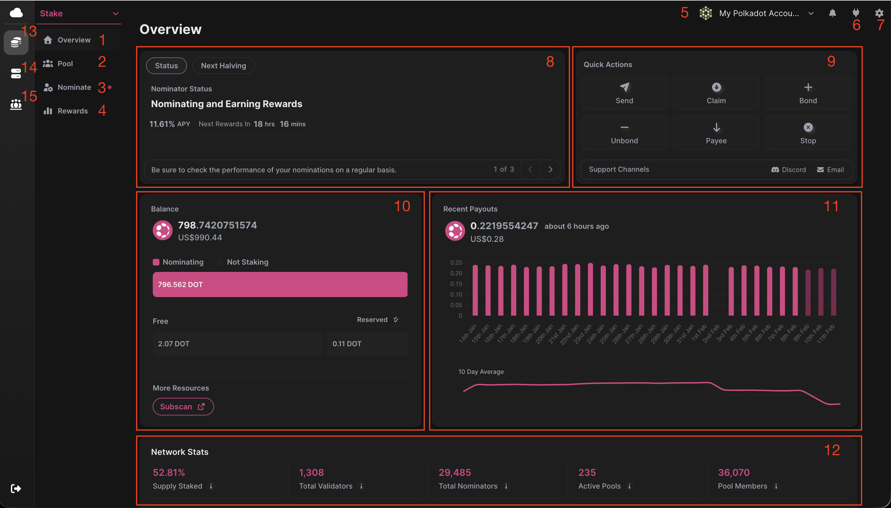11. Recent Payouts: This shows the rewards received, their value, and the release date.