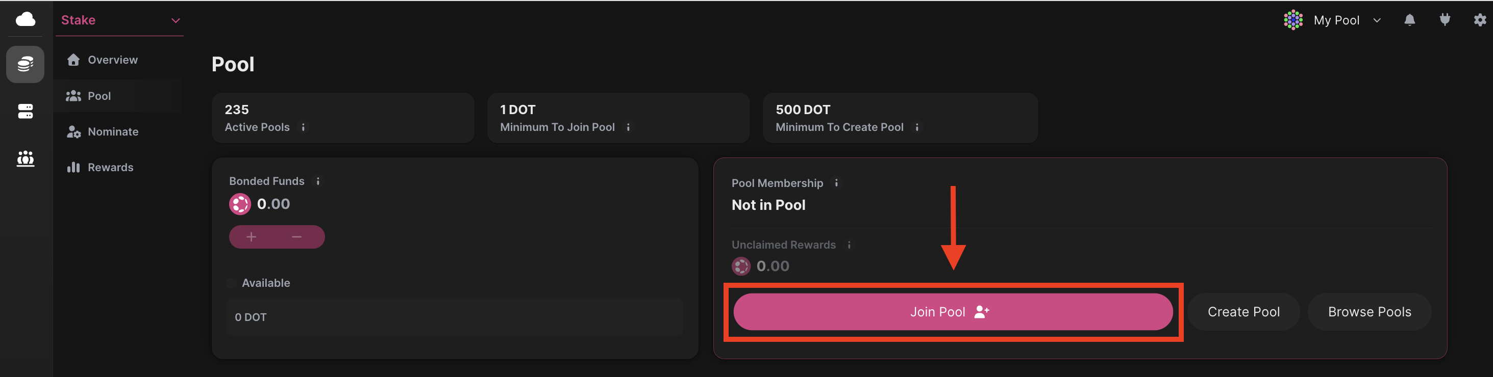 2. Navigate to the "Pool" tab and click the "Join Pool" button. The system will show you Polkadot Cloud pool. You can select it if it suits you, or click "Choose Another Pool" to view a different one. Alternatively, you can go to the "Browse Pools" to do your own research and choose the pool that best matches your preferences.