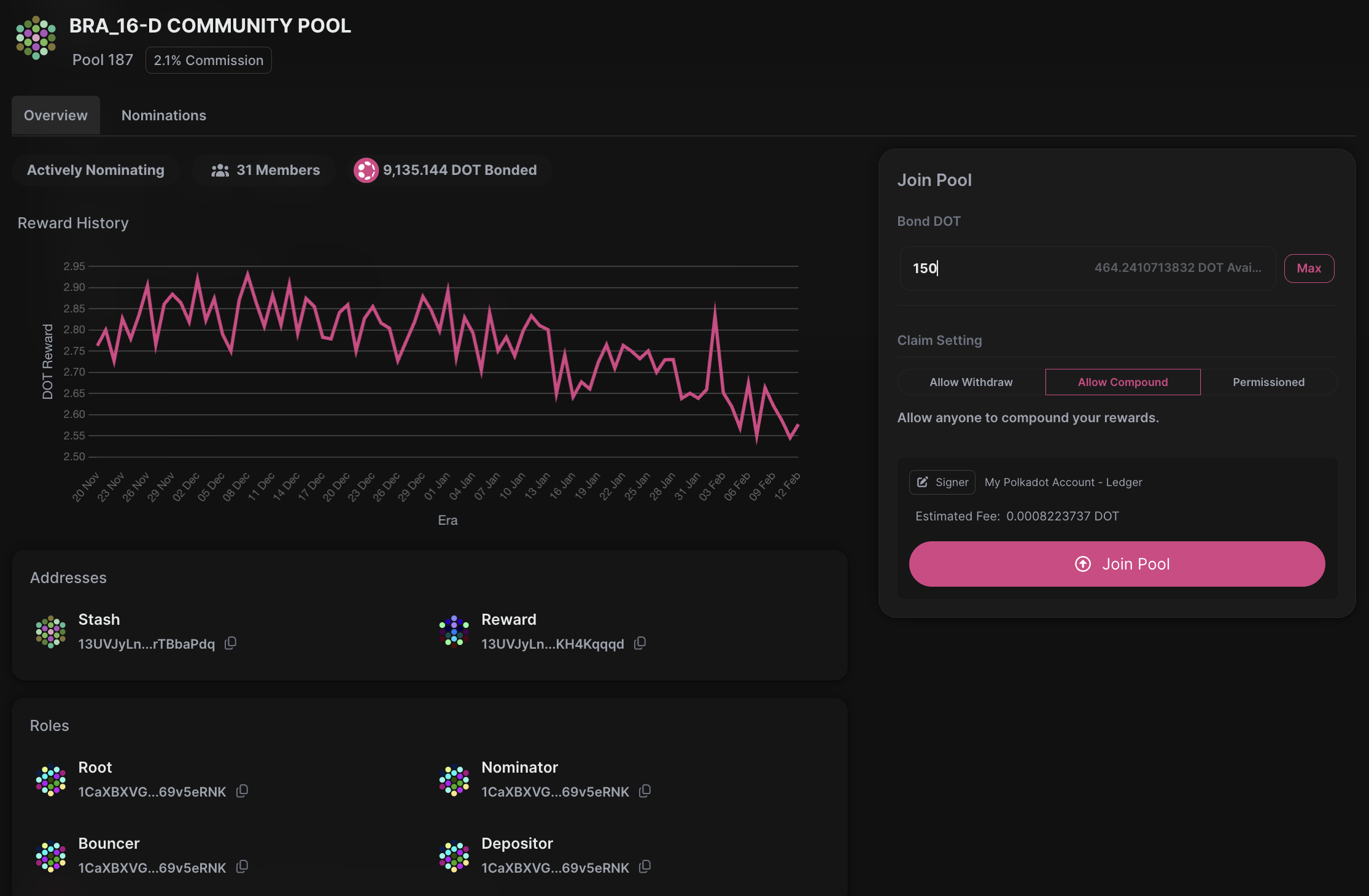 4. In this panel, under the "Overview" tab, you can see key information about the pool, such as the reward history, total bonded amount, and assigned roles. In the "Nominations" tab, you can check which validators the pool is nominating.