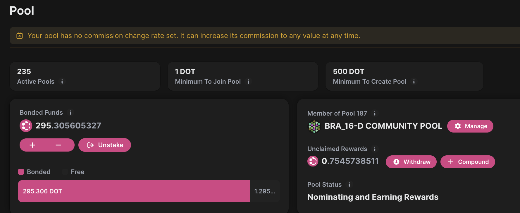 5. Once you sign the extrinsic, the "Pool" page will be presented again, displaying the information about the nomination pool you joined: