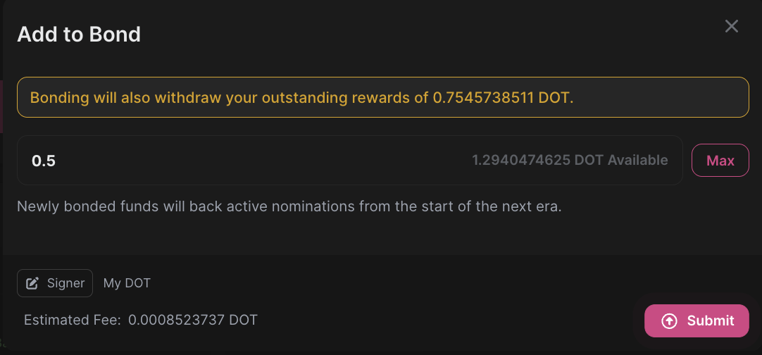 On the right side, you can enter the amount you want to bond and choose how rewards will be claimed. You can allow anyone to claim them to your account, automatically compound them back into the pool, or select permissioned mode, where only you can claim your rewards. When ready, click "Join Pool" and sign to confirm: