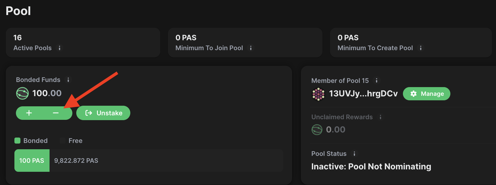 1. If you intend to unbond a portion of your tokens from the pool, click the minus button: