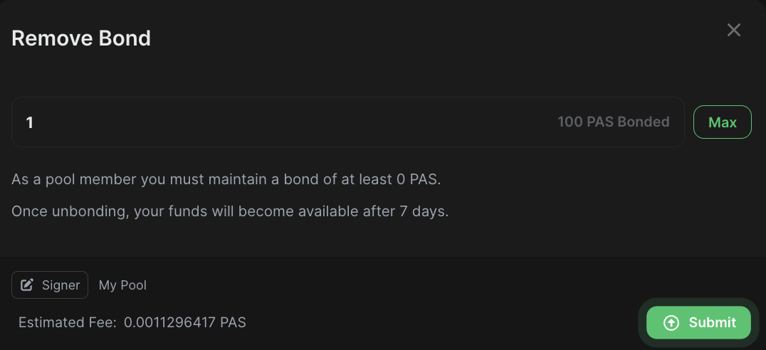 2. A Remove Bond pop-up will be displayed. Here, you can enter the amount of tokens you would like to unbond. You can click the "Max" button to unbond all except the minimum amount required to remain a member of the pool: