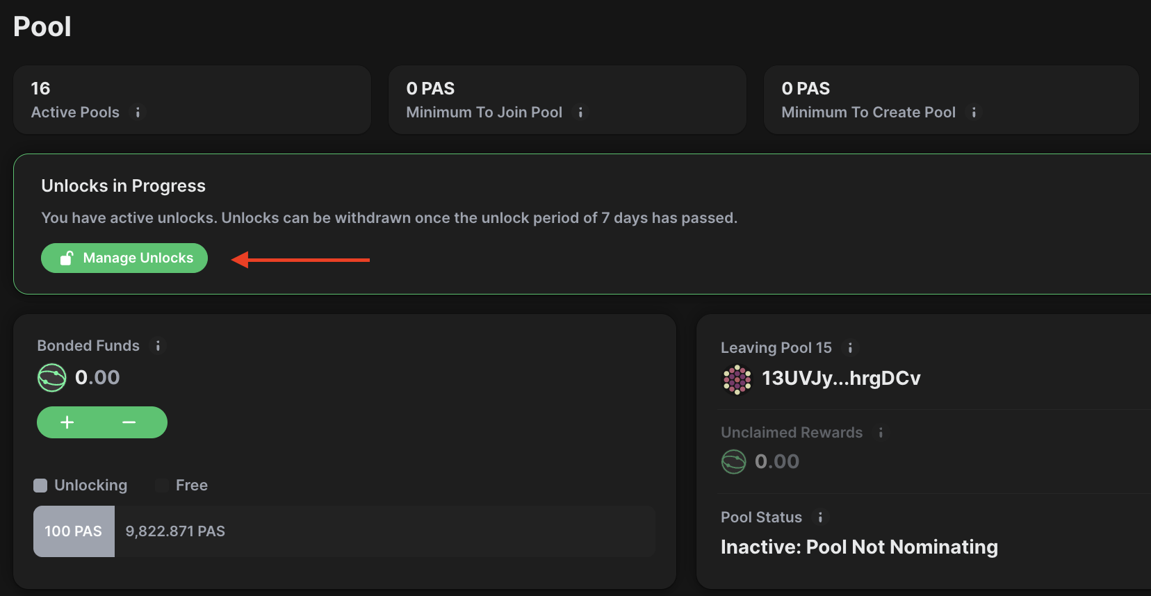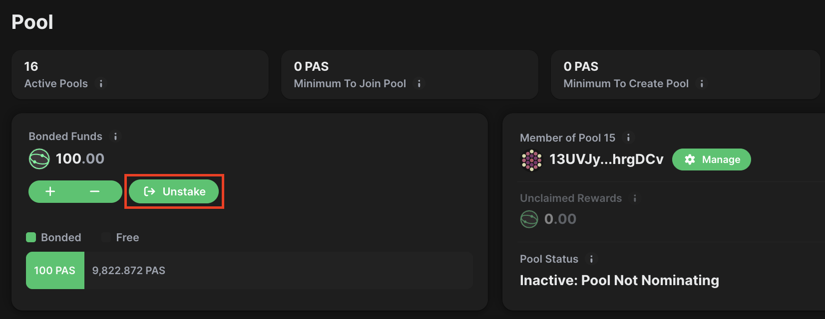 1. If you intend to unbond all your funds, click the "Unstake" button next to the plus and minus icon. Unbonding and withdrawing in this way fully ends your relationship with the pool, allowing you to join a different one if desired: