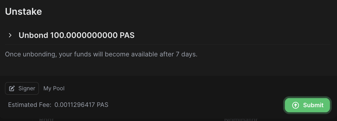 2. This option always unbonds the full amount you had in the pool. Click "Submit" and sign the transaction to unbond: