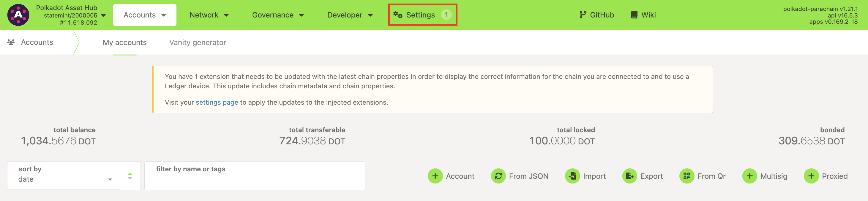1. If one of your extensions needs to be updated, you will see a counter next to Settings and a warning on the Accounts page on the Polkadot Developer Interface: