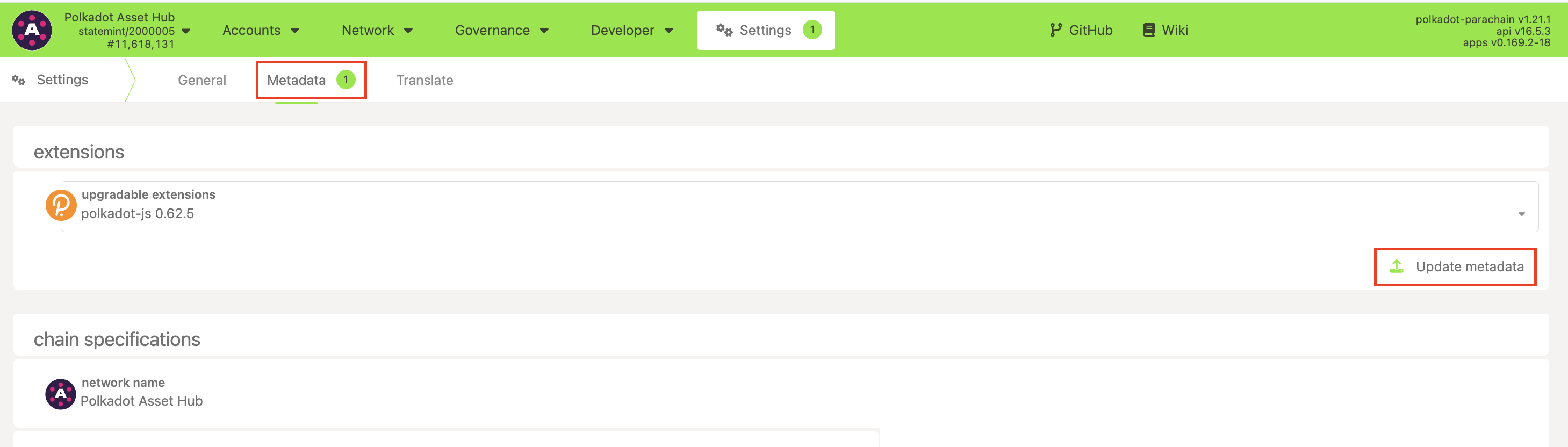 - Chain: each chain has its own metadata, so you must update it separately for each network you use.
