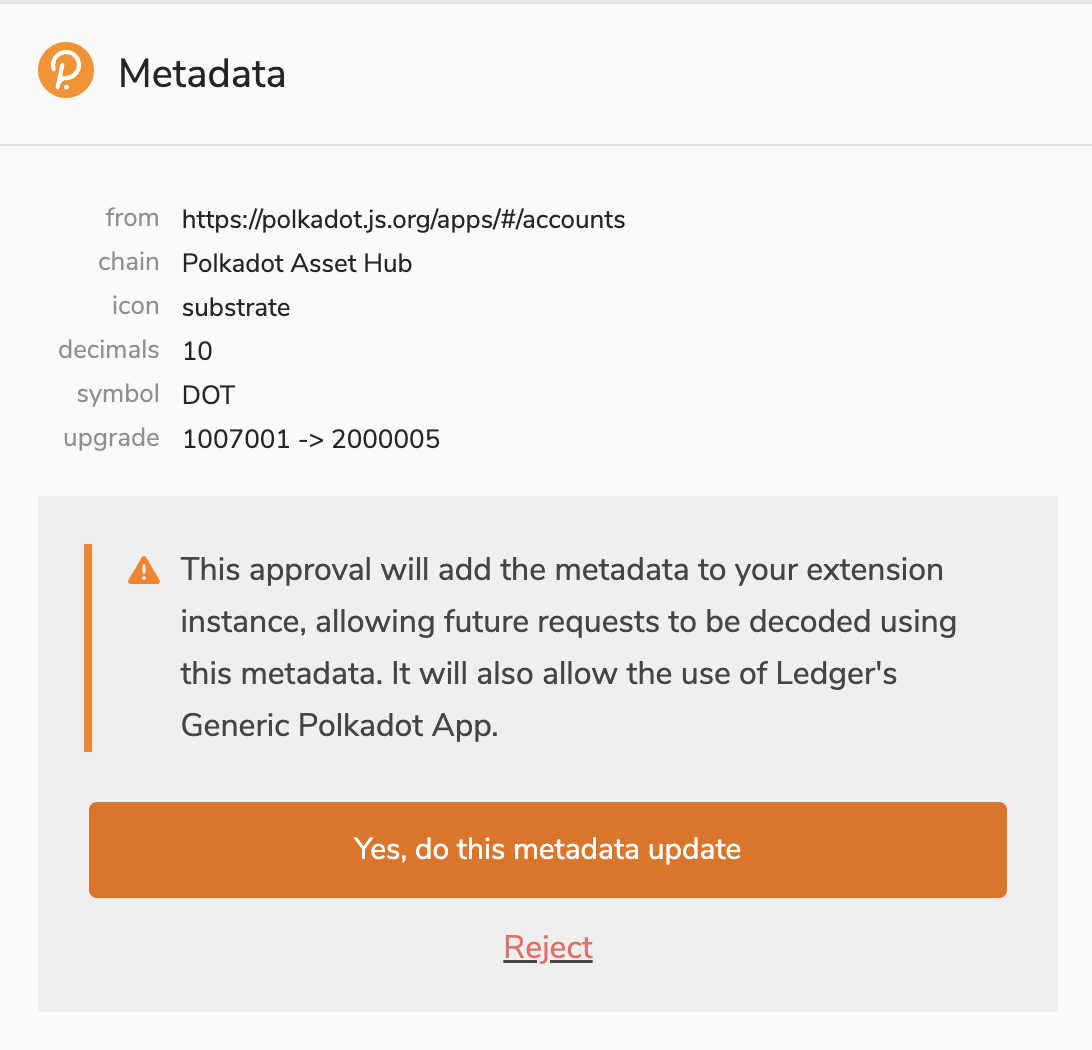 Only allow metadata updates from trusted sources, like the Polkadot Developer Interface. Do not sign a transaction if you cannot verify what you are signing or you suspect you might be signing a different extrinsic than the one intended.How to update the Polkadot Developer Signer metadata on the Polkadot Developer Interface