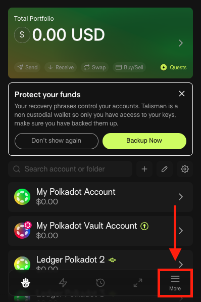 1. To add a read-only account in Talisman Wallet, click the hamburger menu icon ("More"), and then select "+ Add account":