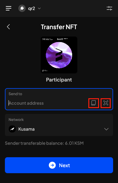 2. On the next screen, select the recipient account. You can paste an address, select it from your address book, or scan its QR code:
