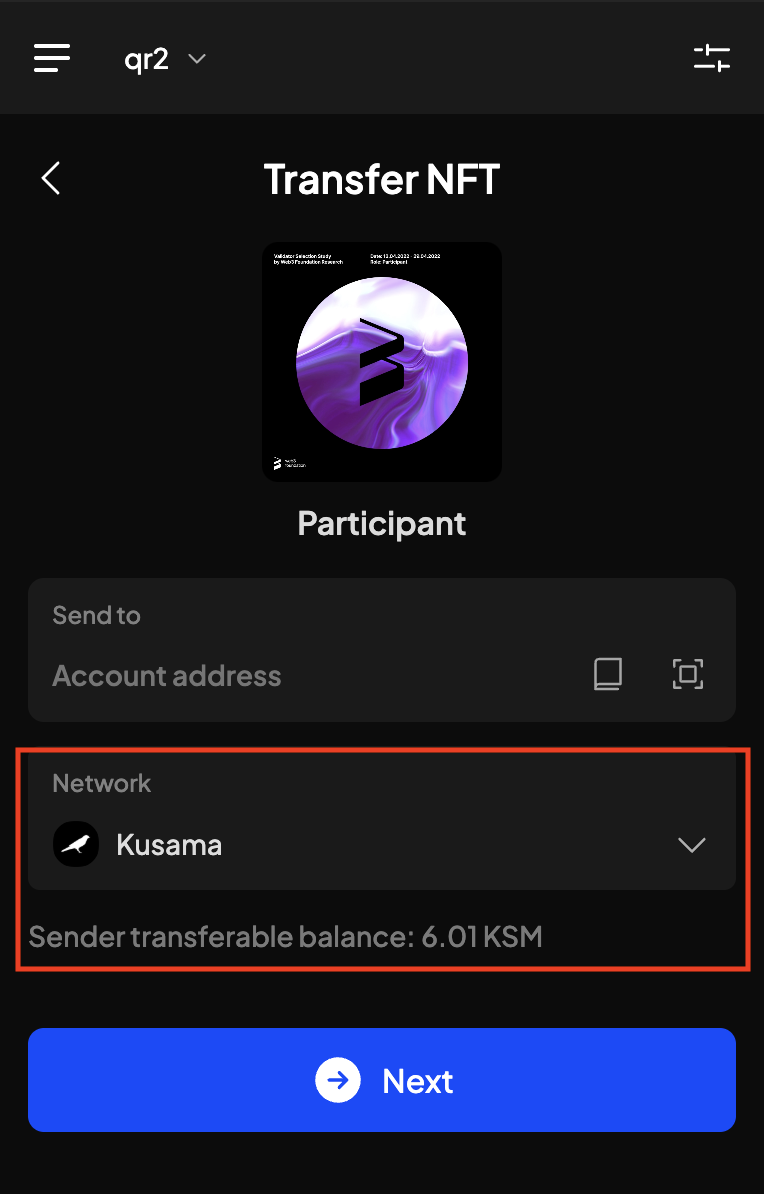 Below the network you can see the sending account's available balance. In order to send the NFT the account needs to have enough balance in the native token to pay for the transaction fees.