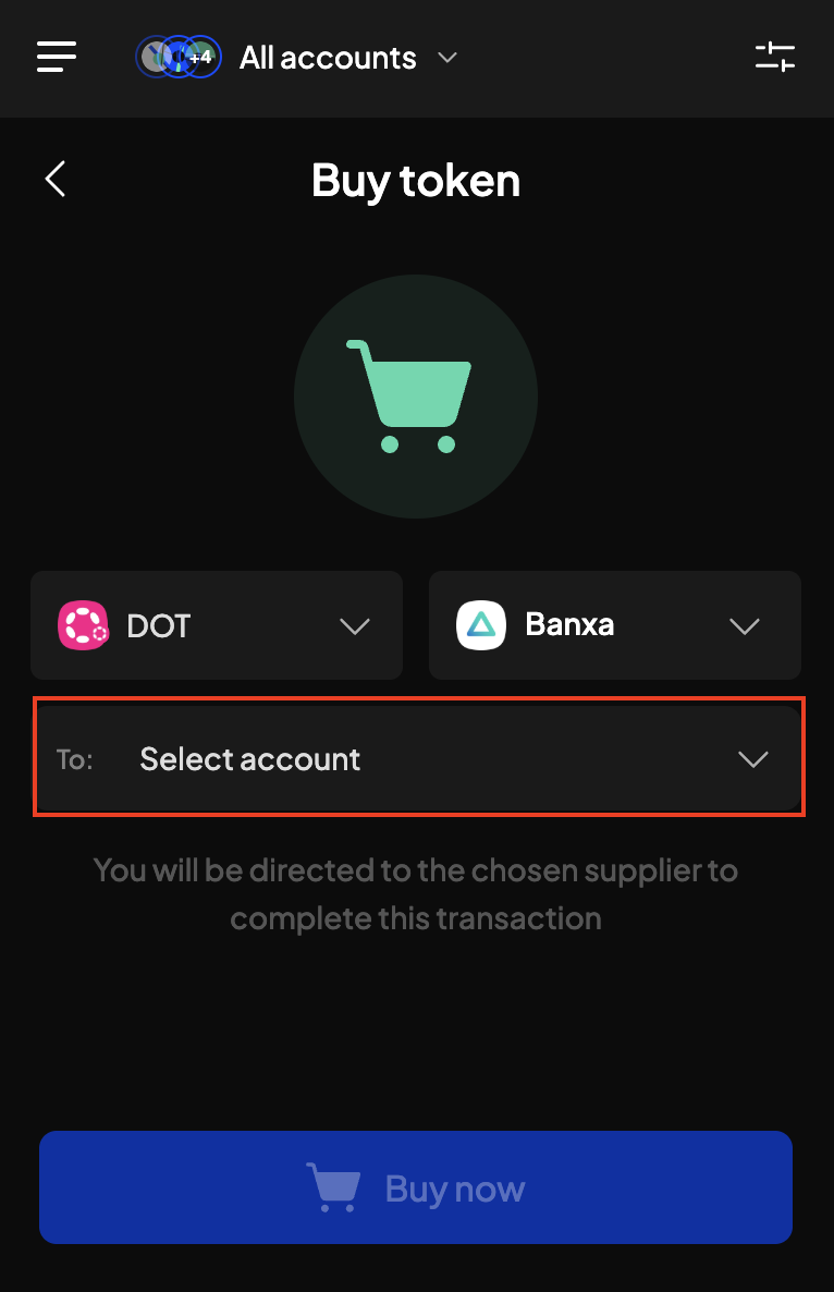 1. On the main page, select the account you want to credit from the accounts selection menu and click on the "Buy token" icon: