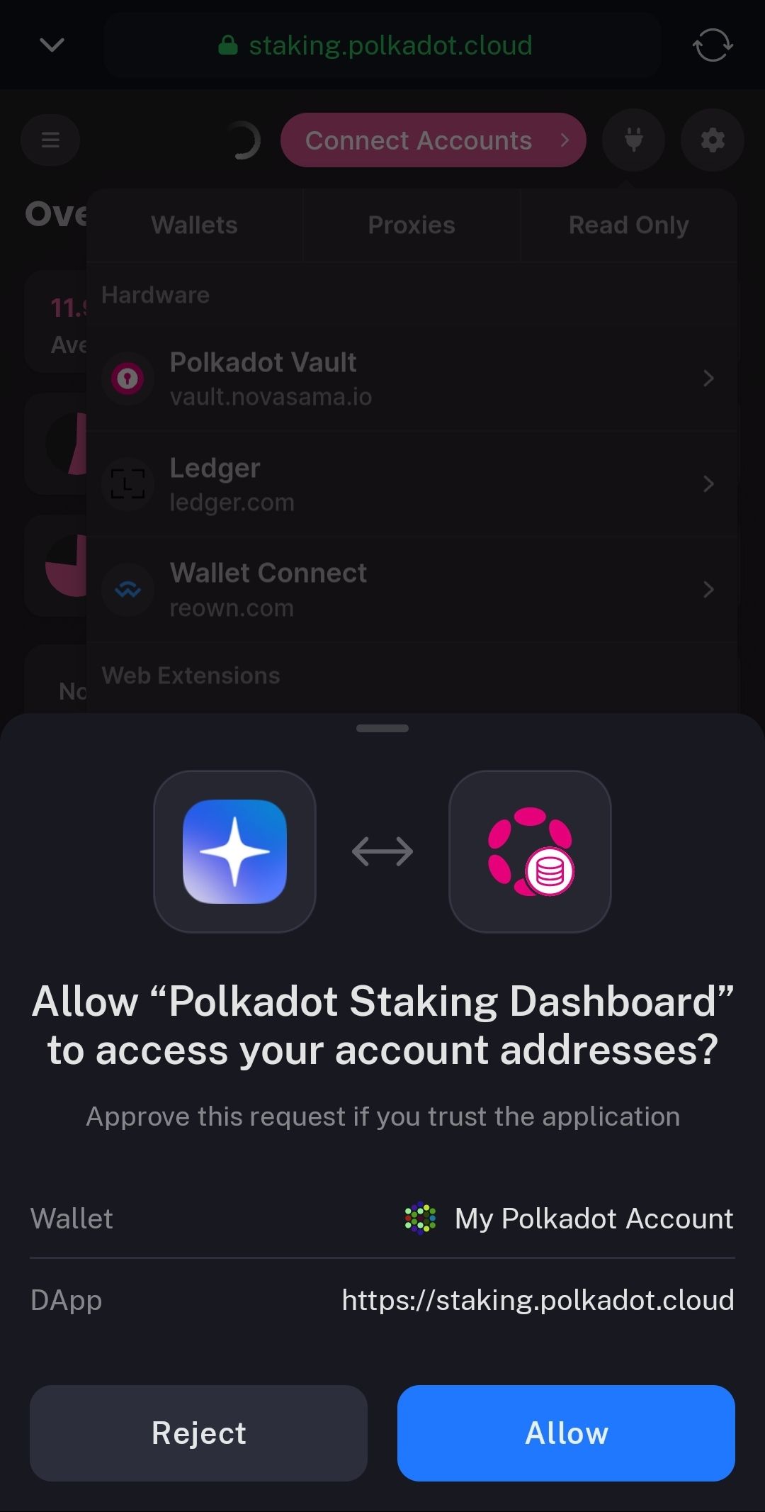 6. Allow the Staking Dashboard to view your active account in Nova Wallet: