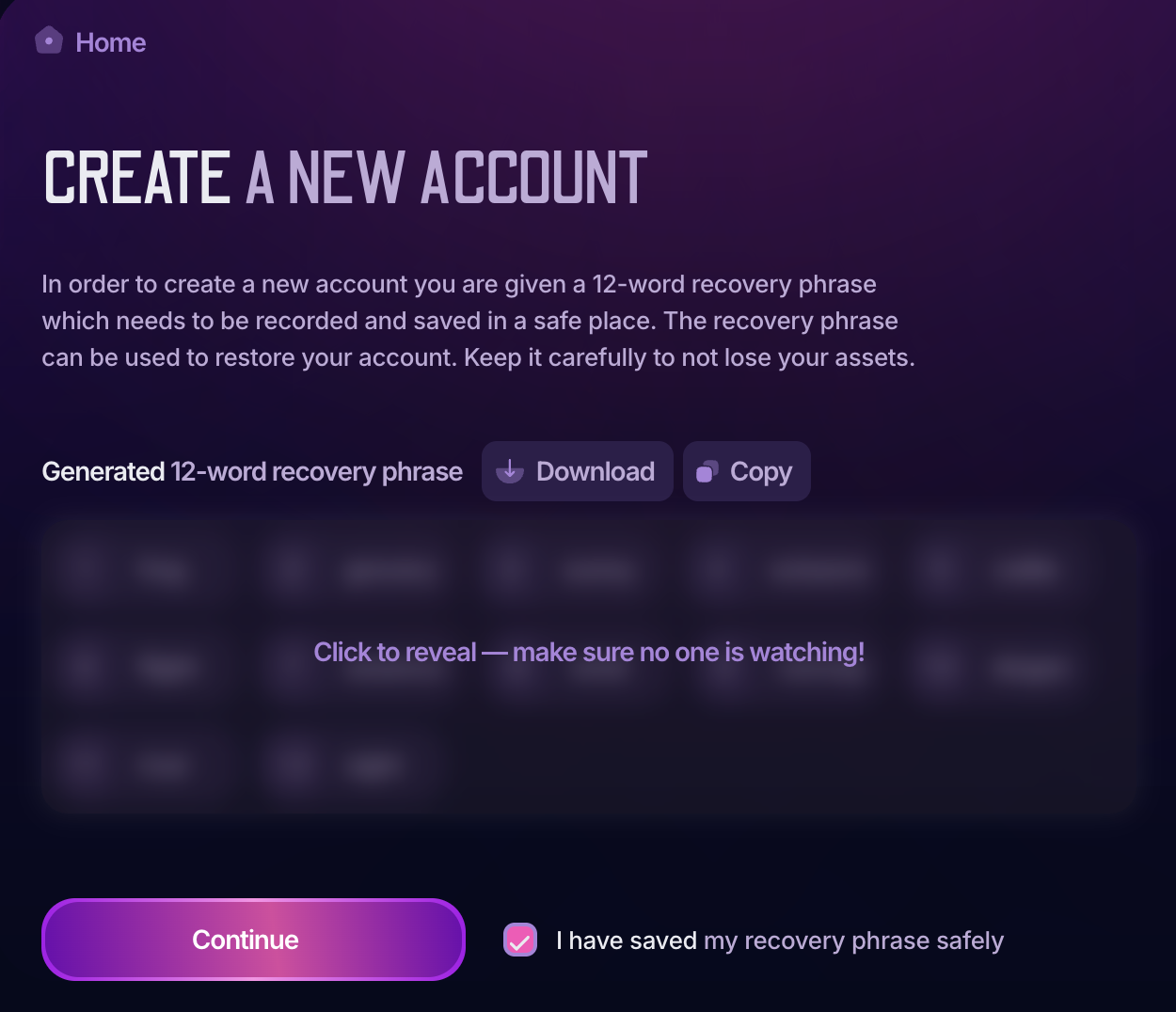 3. A new window will appear. The mnemonic phrase associated with the new account that you are creating will be displayed after you click the obscured central section. Be aware of the potential consequences of losing the recovery phrase or allowing unauthorized access to it. Once this is done, mark the checkbox and click "Continue":