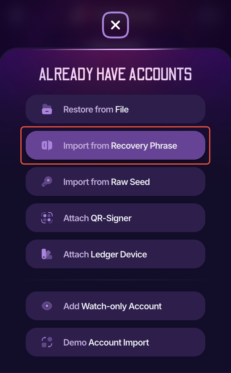 1. All the recovery options will be displayed. Select "Import from Recovery Phrase":
