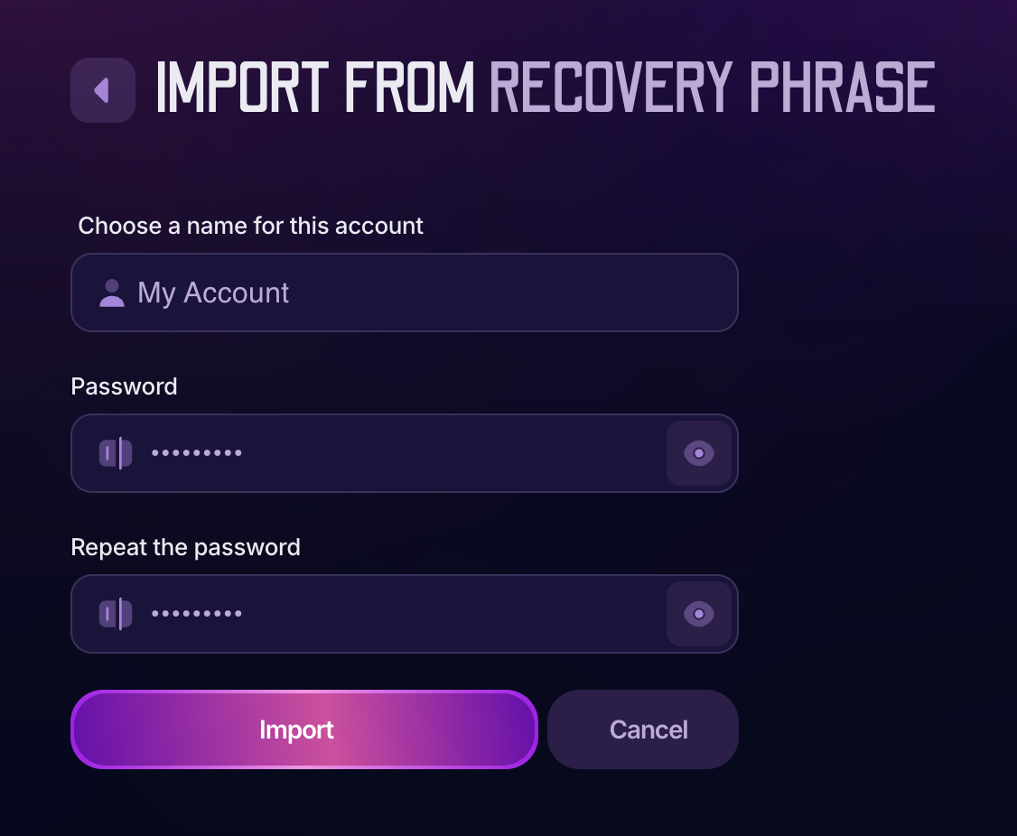 3. Name your account. The name is only used locally for your convenience and doesn't appear on-chain. Set a good password for your account and confirm it, then click "Import":