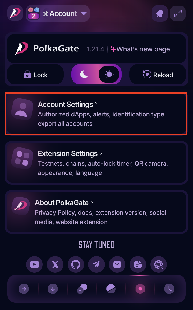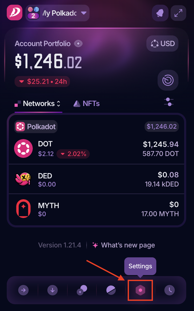 2. Once you've unlocked PolkaGate, click the settings icon: