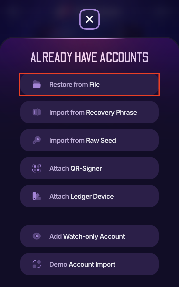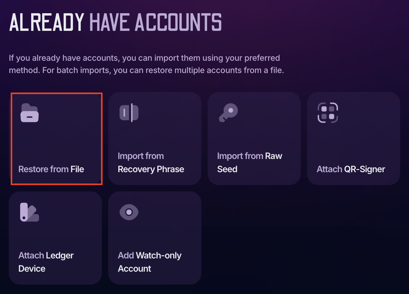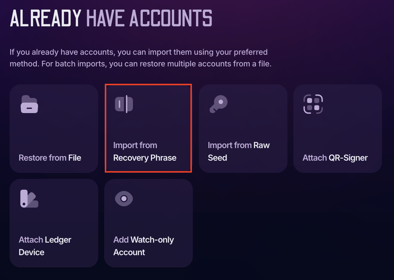 If you want to restore additional accounts in PolkaGate, follow the steps below. After that, continue with the specific restoration method.
