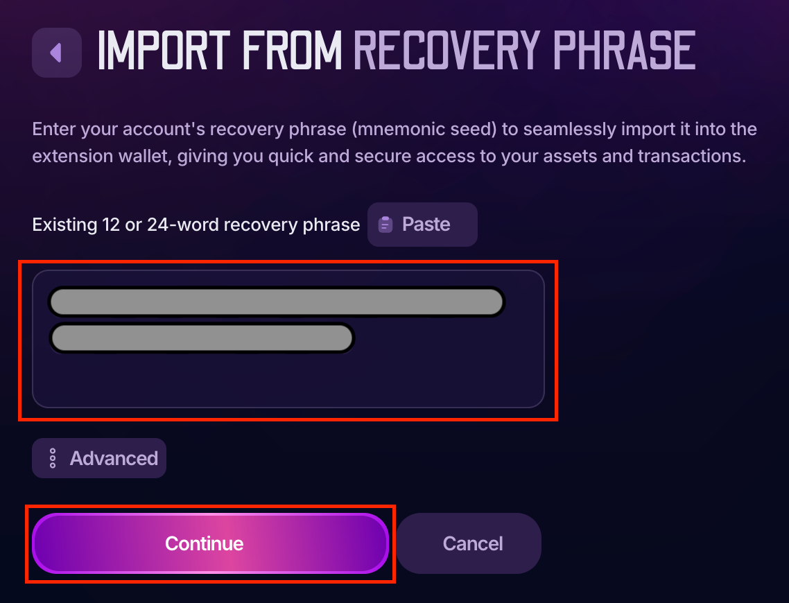 2. A new tab will open in your browser. Enter your mnemonic phrase (typically, 12 or 24 words), and click "Continue":