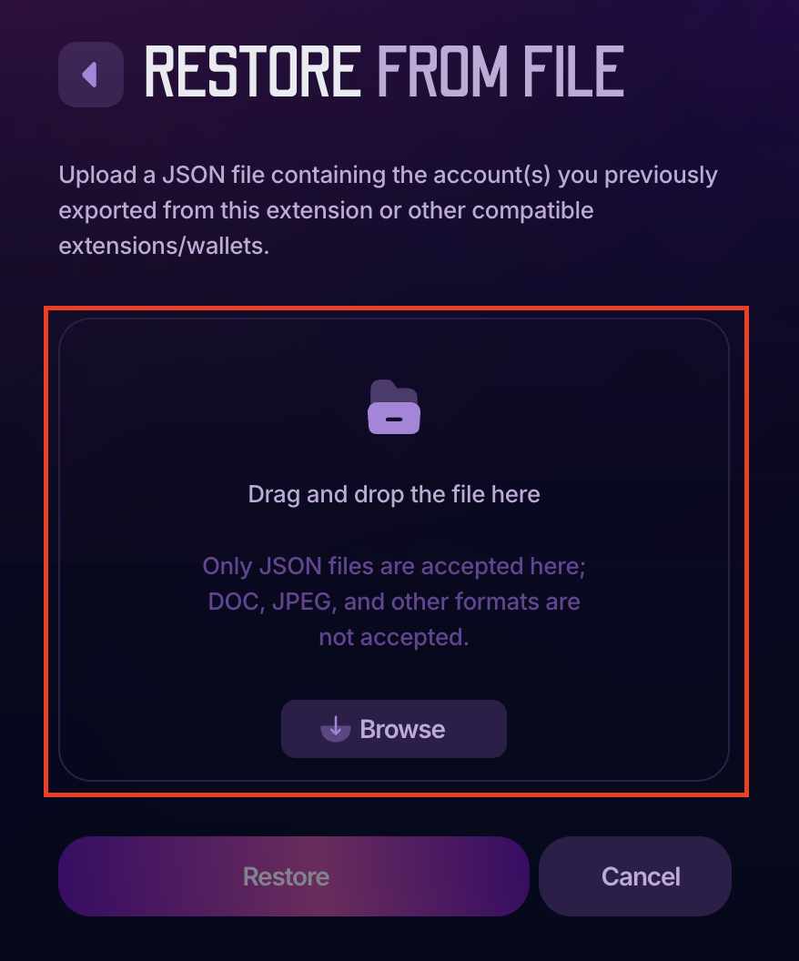 The next step is common for both the mnemonic phrase and the JSON file restoration process. Once completed, you can proceed using your preferred method.