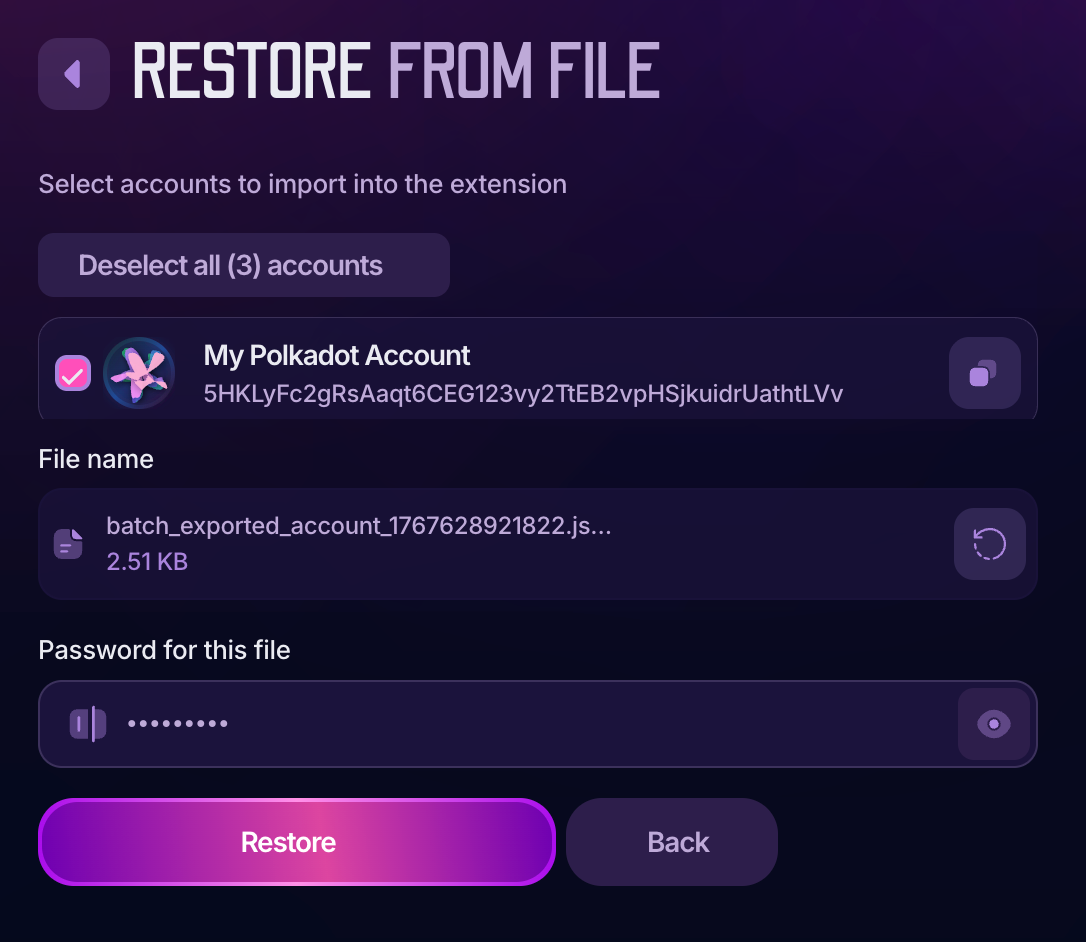 In this article, we'll show how to restore your Polkadot account in PolkaGate with either its mnemonic phrase or JSON backup file and password.