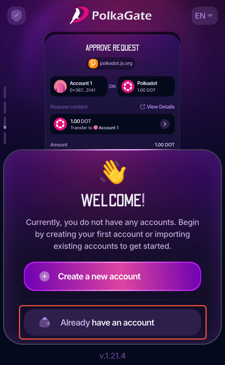 1. If you don't have any accounts yet on PolkaGate, click "Already have an account":