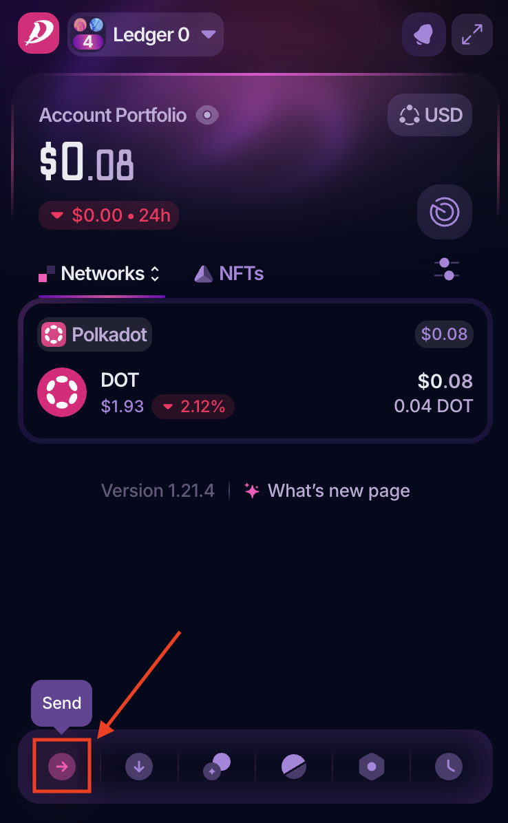 1. Open your PolkaGate extension and click on the "Send" icon at the bottom of the screen: