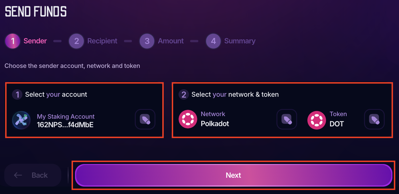 2. The extension will open in a new tab. Select the account, the origin network, and the token you want to send, and click "Next":