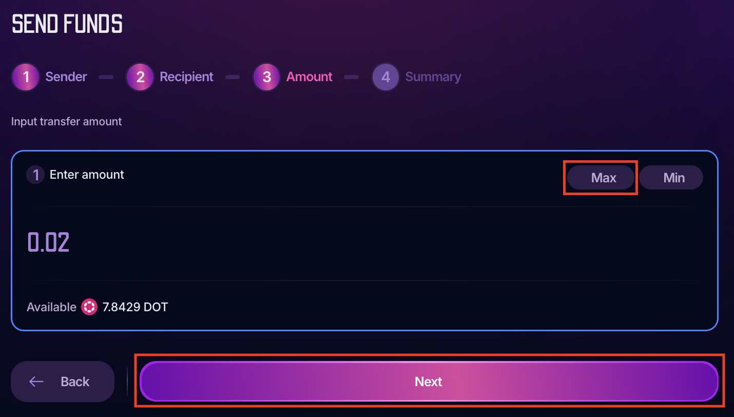 ⚠️ ATTENTION Do not send an amount equal to or lower than the existential deposit of the destination network; otherwise, your account will be reaped and any remaining balance will be lost! Additionally, take transaccion fees into consideration. Read this article to learn more and to find the existential deposit for Polkadot and Kusama system chains.