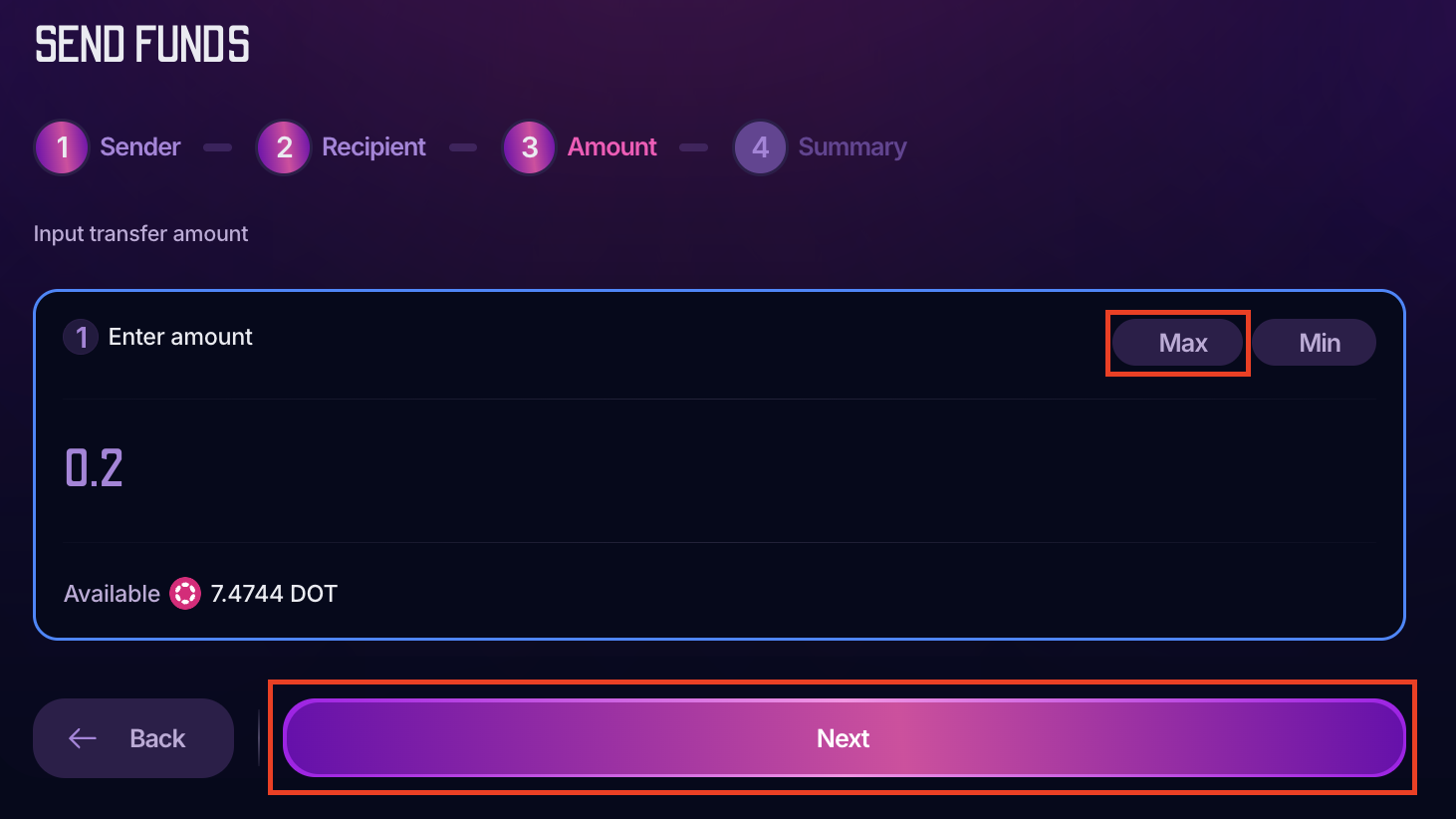 4. Enter the amount you want to send. Click "Max" if you want to send the whole available balance, and click "Next":