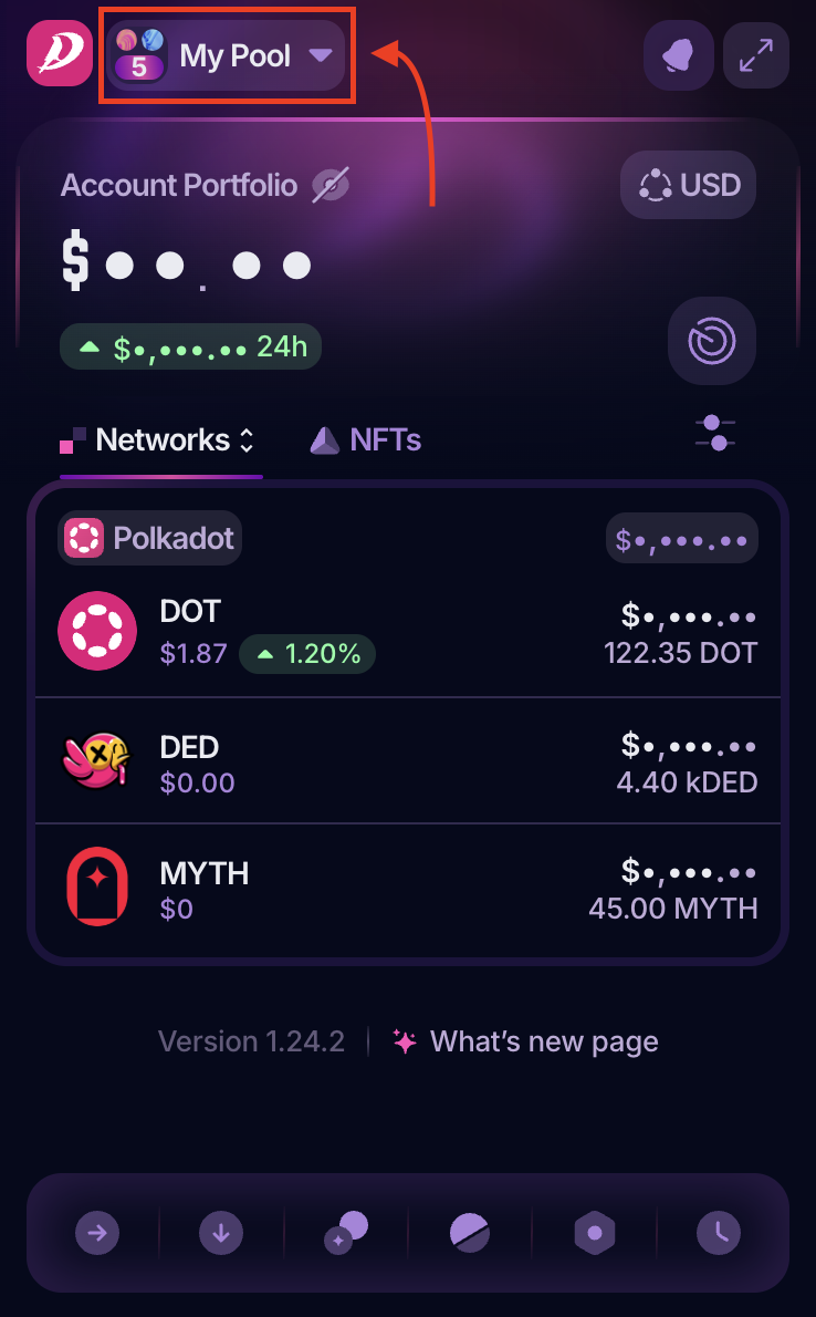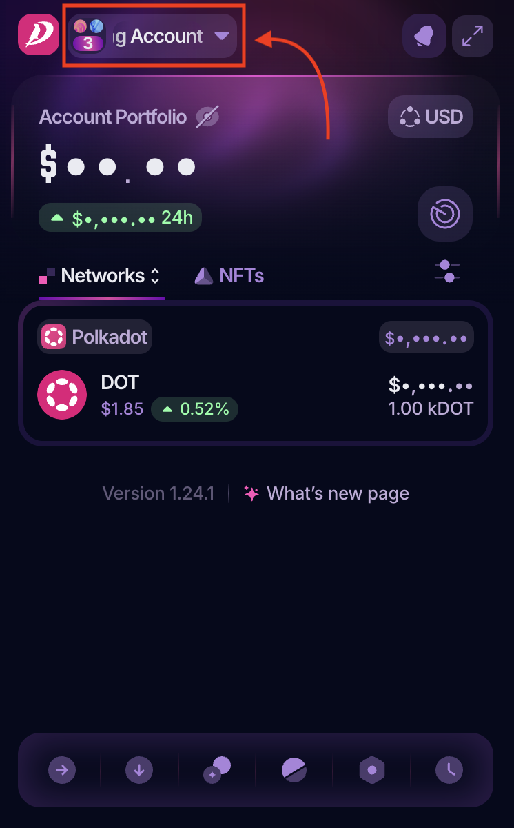 1. Open your PolkaGate extension and in the drop-down menu, select the account on which you want to stake your DOT: